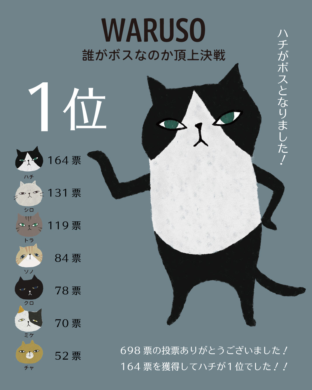 文具フェスタにてWARUSOのボスキャラを決める「誰がボスなのか頂上決戦!」698票の投票数の中164票を獲得した「ハチ」がナンバーワンボスキャラに決定しました。来場したたくさんの人に投票に参加いただきありがとうございました!